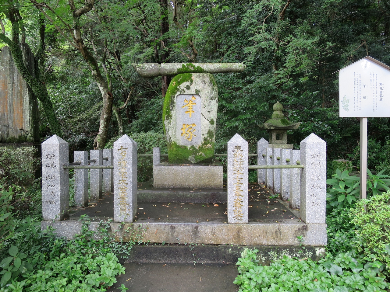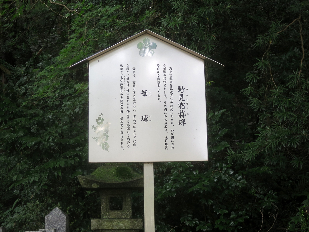 菅原道真公は三筆の一人にも三蹟の一人にも数えられてはいませんが、三聖の一人であるそうです。三筆・三蹟ともに「日本史B」の教科書にある有名な言葉ですが、三聖という表現は初めて知りました。三聖の他の二人は三筆の一人の空海、もう一人は三蹟の一人の小野道風ですから、三聖とは、三筆にも三蹟にも数えられていない菅原道真公のために無理やり後付された格付けのようにも思えました。ただ、菅原道真公は文章博士でもあったわけで、筆を書の象徴とするよりも、学問を象徴するものとして捉えたものなのかもしれません。筆が乗せられた碑の形は結構ベタなデザインの碑ではありますが、分かりやすいと言えば分かりやすいです。
