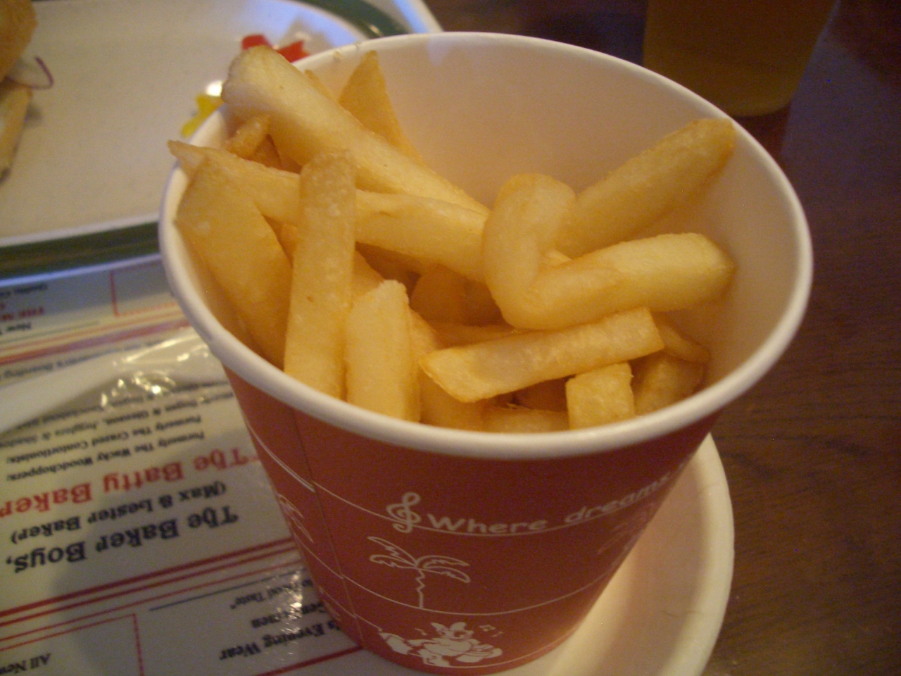 旦那さんはビールとサーモンのベーグルサンド、私はポテトとアイスコーヒーとNYチーズケーキを注文。どれもそこそこ美味しかったです。ディズニー内では安い方だと思います。