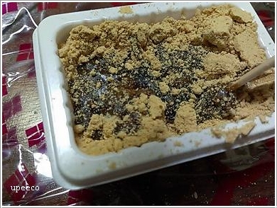 小さい容器に入ったお餅にきな粉と黒蜜をかける瞬間が至福のとき・・♡