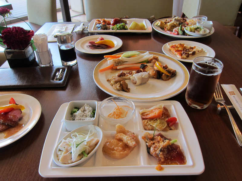 焼津グランドホテルにあるレストランです。ランチブッフェが評判とのことで、土曜日に行ってみました。12時半頃でしたが、レストラン内は満席でウエイティングの方も結構いるとのこと。ラウンジのテーブルで良ければすぐに席は用意できるとのことで、ラウンジに席を取りました。料理を取りに行くのにほんの少し歩くだけで、何ら問題なし。むしろテラス越しに見える相模湾の雄大な海の景色はレストランの中よりもいいかも。さらに喧噪もなく静かに食事できました。