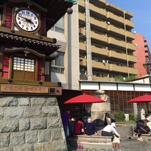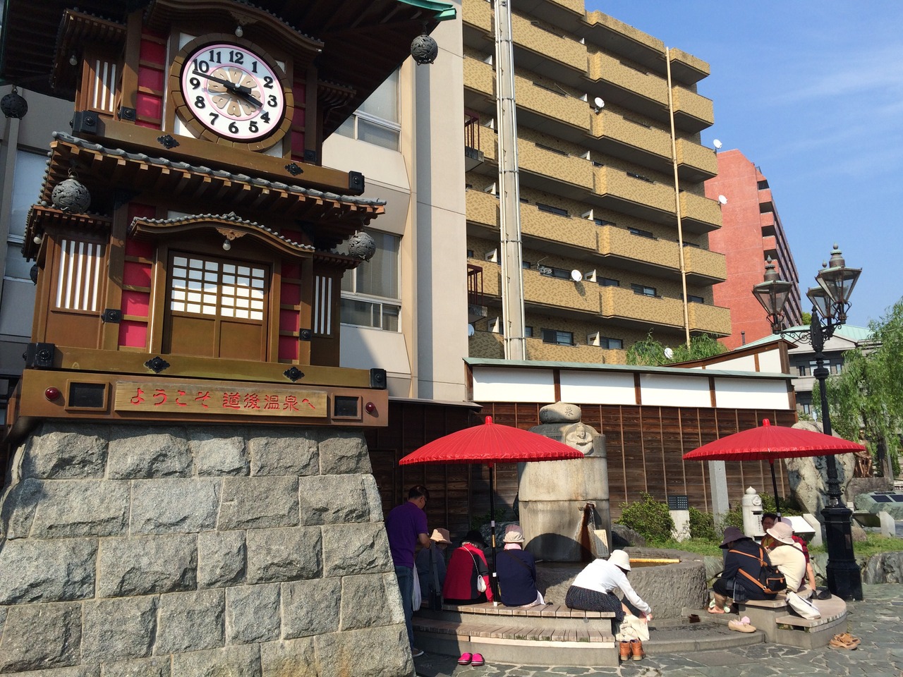 道後温泉駅の目の前にあり、直ぐ横には坊ちゃんカラクリ時計があり日中1時間に1回時計が鳴るので人が多いエリアです。無料の足湯で20分ぐらい足の疲れを癒し、時計の音と道行く人を見ながら浸かりました。最初は少し熱かったですが徐々に慣れてきました。