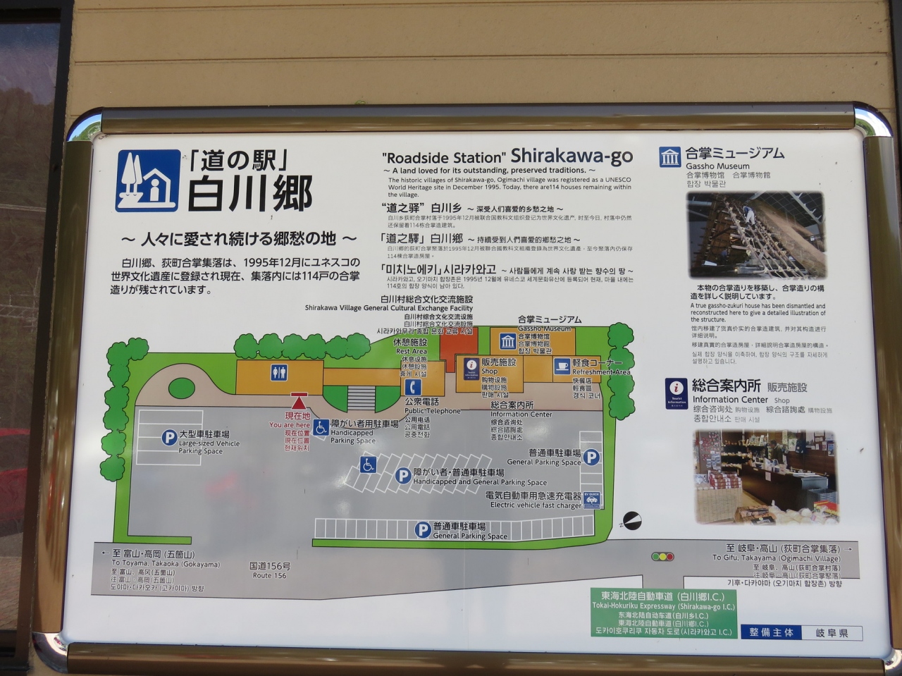 高速道のICを降りて、連絡道路で一般道に降り着いたT字路の左にあります。但し、白川郷が右折なので、此方の道の駅に入る方は少ない気がします。駐車場も広く、左側の建物が大きな茅葺きになっています。右側の建屋に土産物と食堂が入っていました。