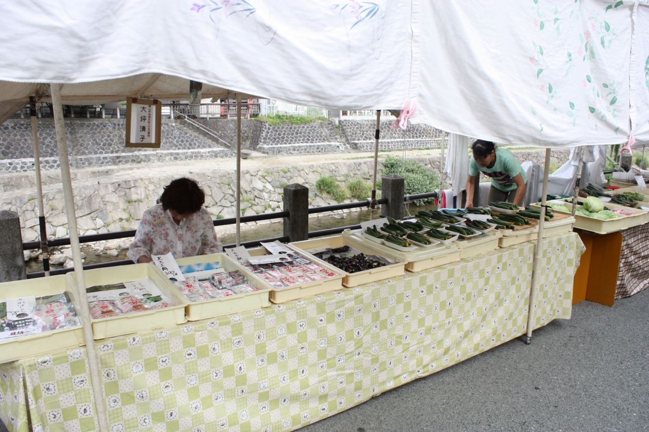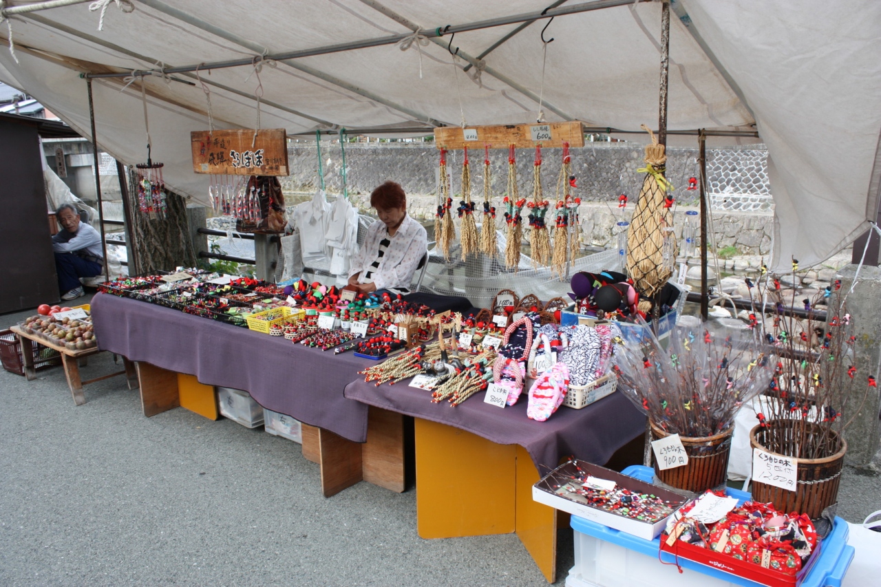 宮川沿いの朝市は川を背にしてテントが並びます。土産物と地元の野菜が主だったものみたいです。これに合わせて向かいの店舗も早々とオープンしています。此方の店舗は午後になると朝市と一緒に店じまいするところが多いです。朝以外は別な店舗で営業中とのことです。陣屋前の朝市は 広場にテントを並べて営業中です。地元の野菜や果物をおばあちゃん達が売っています。試食を振舞ってくれるので、此方歩方が人気かもしれません。但し、テントは30張りぐらいです。御昼ぐらいになると、息子達が軽トラで撤収に来ていました。おばあちゃん達の憩いの場も兼ねている気がします。