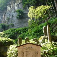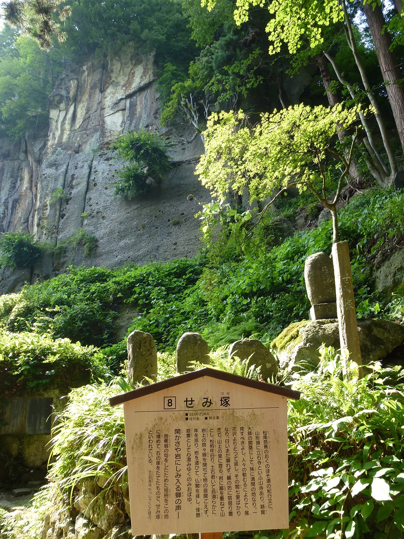 芭蕉の句で、あまりにも有名なせいか、皆さん、ここで休憩し、写真撮影にいそしみます。せみ塚というのは、石の塚を建てたからとの説明版がありましたが、前面の岩肌全体が「せみ塚」と言えないかな、とも思ってしまうぐらい、趣のある場所です。道沿いのアジサイがきれいでした。
