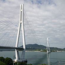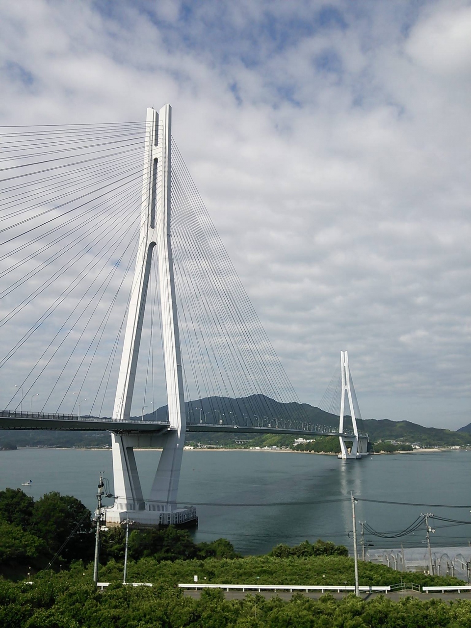 瀬戸内海を結ぶしまなみ海道にあって、広島県と愛媛県をむすぶ橋です。綺麗な斜張橋ですね。生口橋と多々羅大橋と2本斜張橋が続きます。橋脚を反射する音が登り龍のように反射して聞こえる鳴龍が2箇所楽しめます。