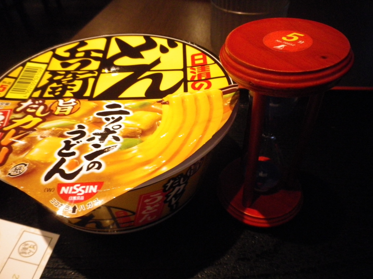 ランチを摂る時間が無く、こちらへ。悩んだ末にカレーうどん(関西味)を注文。以前にも感じたが、店内にひたすら同じCM?が繰り返し流されており、耳障り。もっとも店内で仕事をしているツワモノもいた。どん兵衛、全品220円。高いか、安いか?