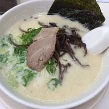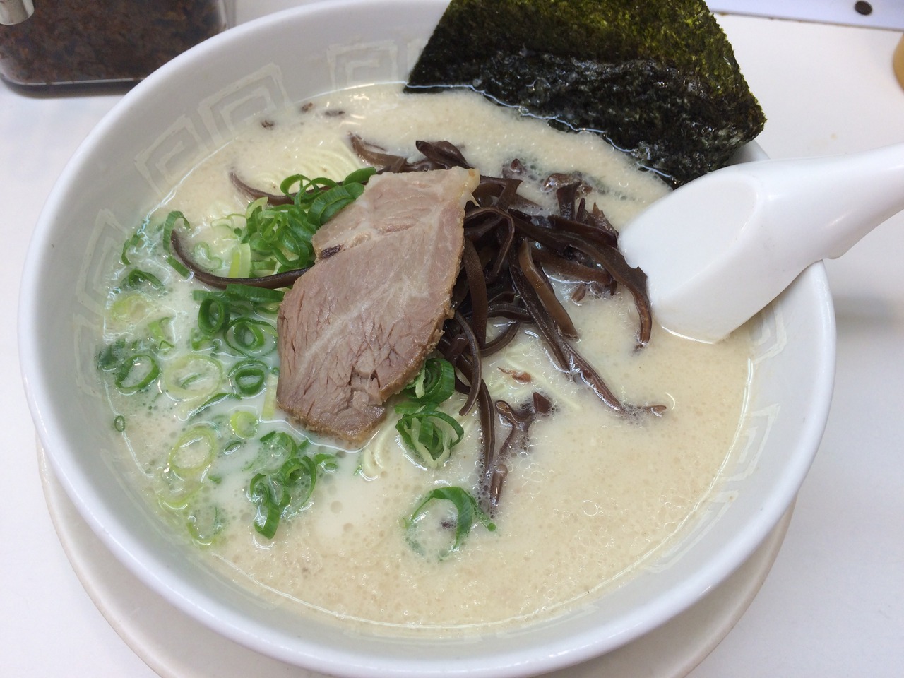 味わい深くもさっぱりしたとんこつラーメンは飲んだ後でもくどく感じません。まるで牛乳のようなまろやかなスープと細麺、具のきくらげがバランス良いと思います。替玉一回無料ですが、この日はしませんでした。