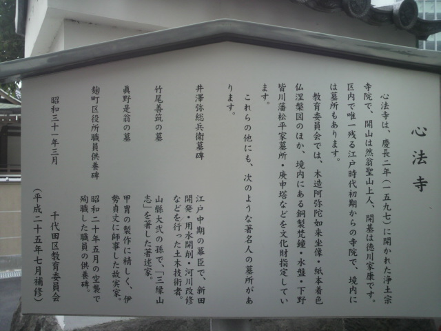 寛永年間に江戸城拡張工事のため、麹町の数多くの神社仏閣が、外堀の外に移転した中において、心法寺は、麹町に留まり、現在に至っています。