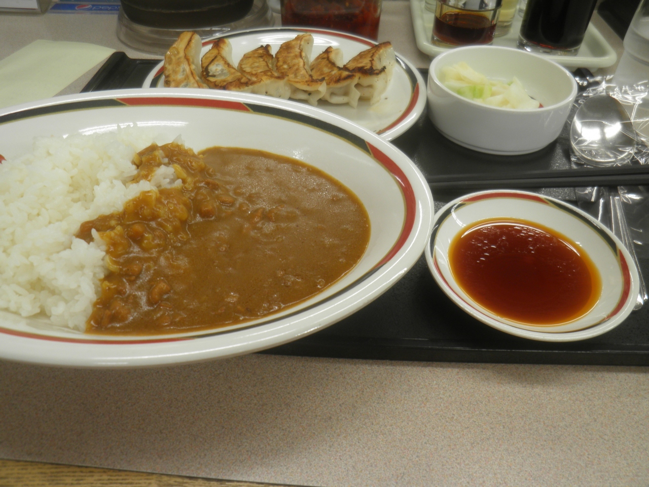 みよしのセットはカレーライスと餃子のセットです。 キャベツの浅漬けがついて500円足らずでお腹いっぱいになりました。 カレーは辛口と甘口を選べます。 昔食べた学食のカレーライスを思い出すような感じです。 出口のところに小さいキャンデーは昔はにおい消しのチューイングガムだったのを覚えています。