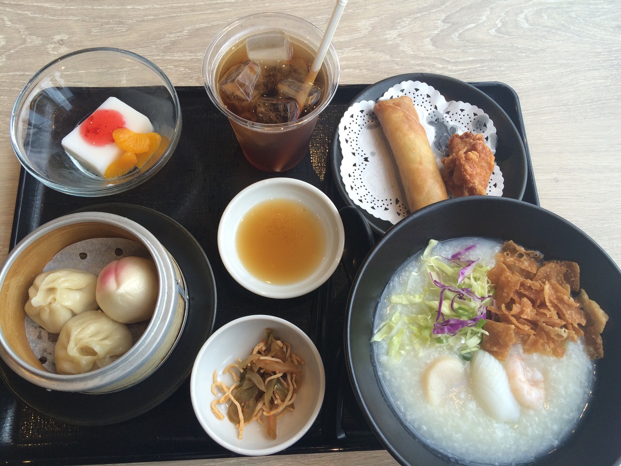 ランチの利用でお粥、点心、春巻、唐揚げ、杏仁豆腐がついているセットにしました!