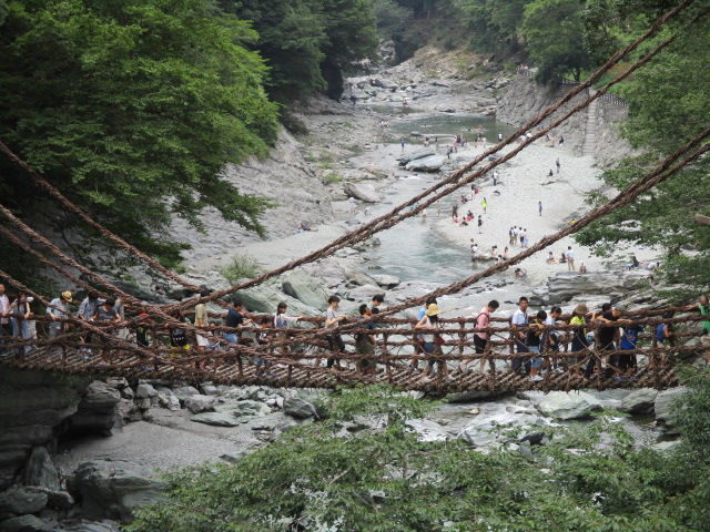 秘境のはず、ですが、道が整備されて行きやすくなり、入り口には駐車場からかずら橋夢舞台という大きな建物があります。かずら橋夢舞台の建物を通って、いやけいおおはし、という普通の橋を渡って、やっと、かずら橋に辿り着きます。かずらで編んだ橋を渡るにはお金がかかり、待ち時間もかかります。