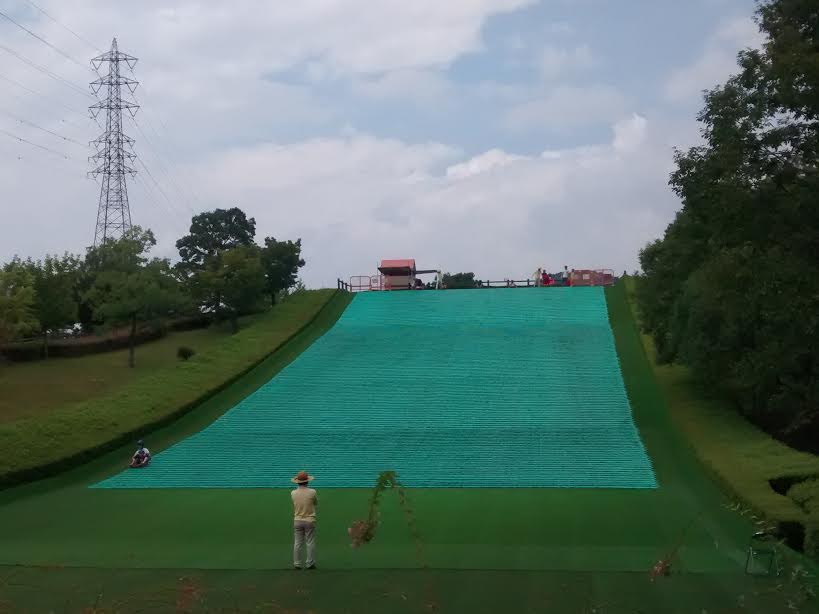 スライダーが人気です。いつも混んでいて、ヘルメットとソリを借りてシューッと滑り降りることができます。