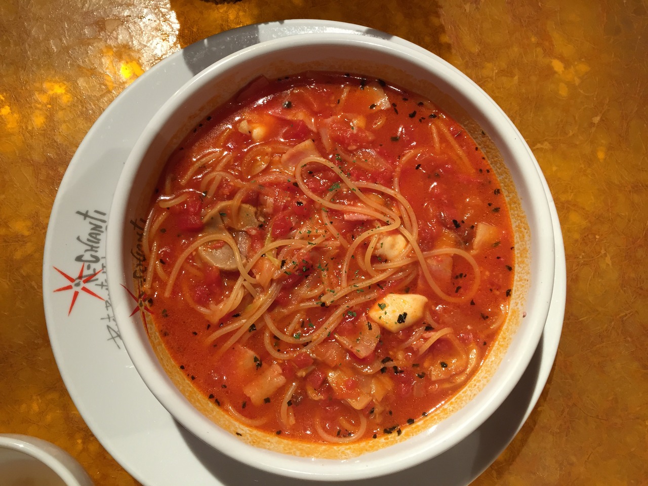 サラダ、スープ、パスタ、パン、ドリンクがセットで1000円ほどで食べられました。
