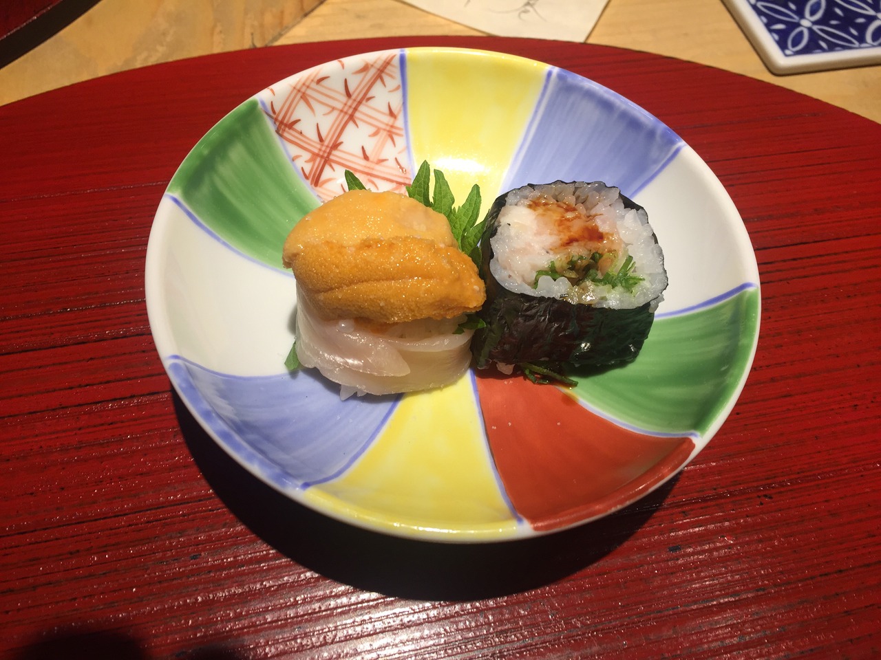 最初に出てきた鶏とうにの握り寿司は、見た目が綺麗で、濃厚な味わいで期待が膨らむ最初の一品でした。