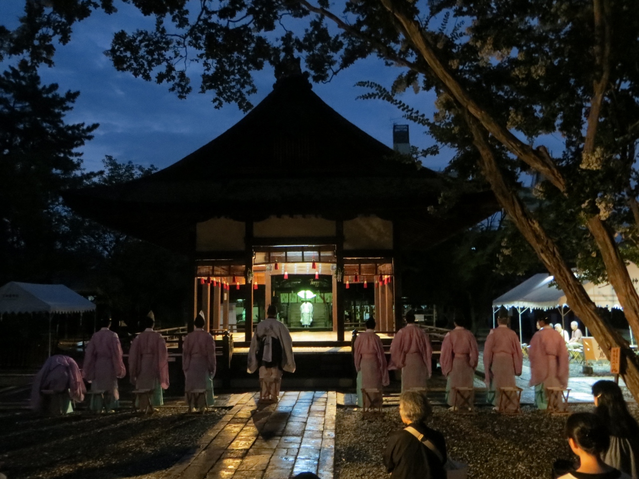 五山の送り火を堪能した次の日、8月17日に京都御所の近く、丸太町通を少し下がった寺町通に面した下御霊神社で例祭が行われました。8月18日の昼間が本番のようですが、その前の夜、前夕神事を見学しました。何とも優雅なお祭り。
