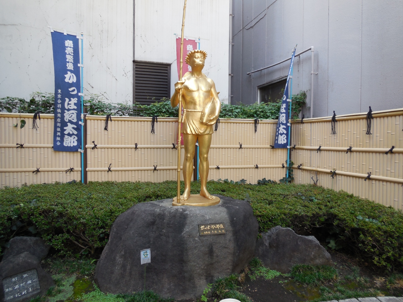 道具街を家族でぶらぶらしていましたら、黄金色に輝く河童を発見しました。この小学生くらいの大きさの銅像は、東京合羽橋商店街振興組合が合羽橋道具街ができて90年目に当たる平成15年10月に建立したもので、合羽橋道具街のシンボルになっています。