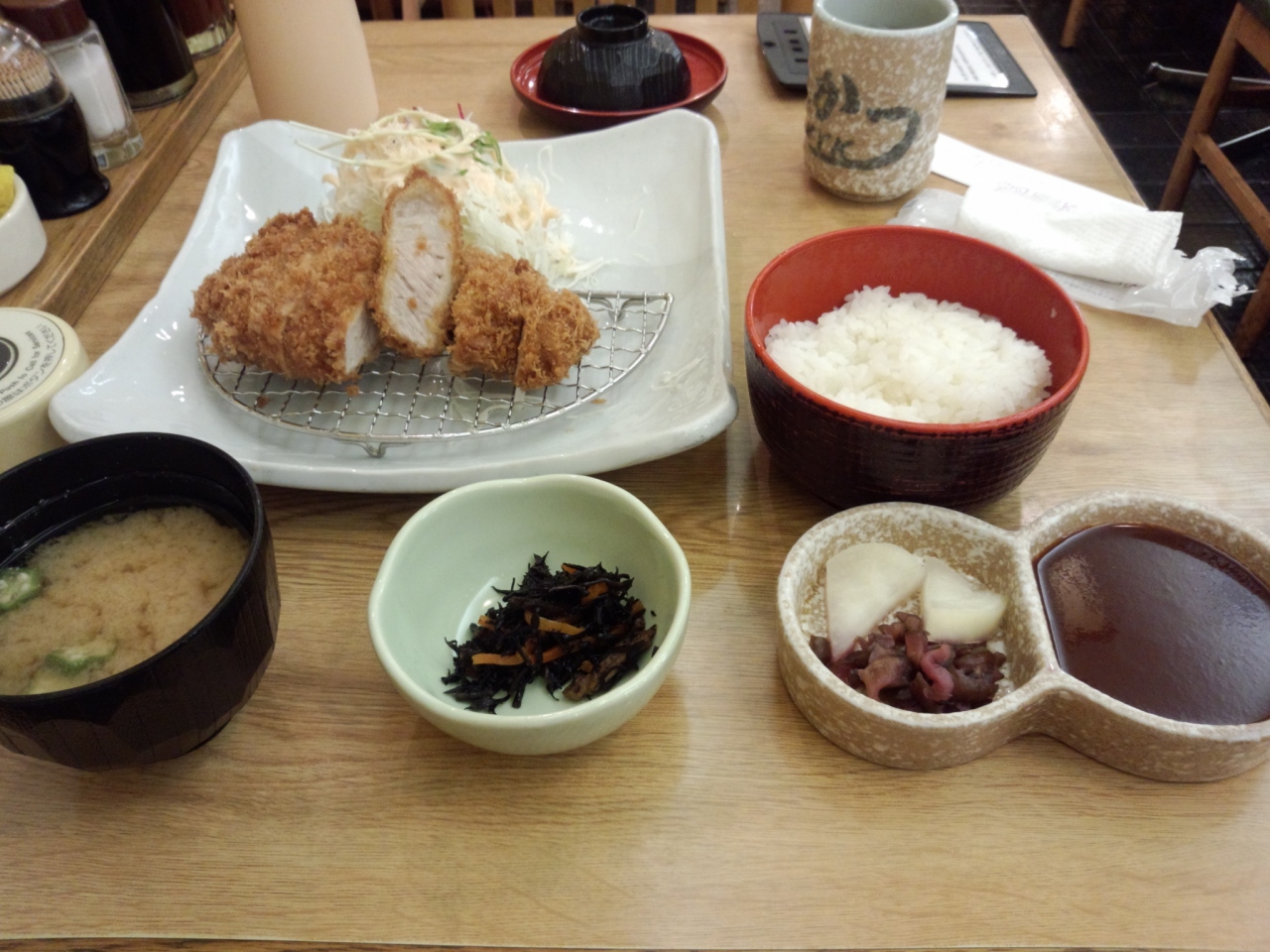 御堂筋線から南海に乗り換える際に立ち寄りました。国産とんかつの厚切りロースカツ定食。程よい脂身でさくっとうまい。みそ汁にはオクラとそうめんが入っていました。