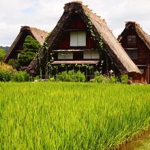 晴れた真夏の空と田んぼと白川郷合掌造りが絵になり、緑が美しいです。