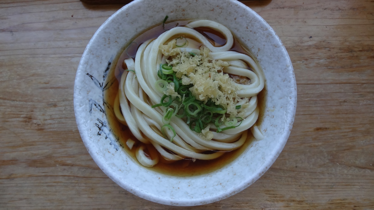 ぶっかけうどんは、すでにだしが入っているので、ねぎと天かすを