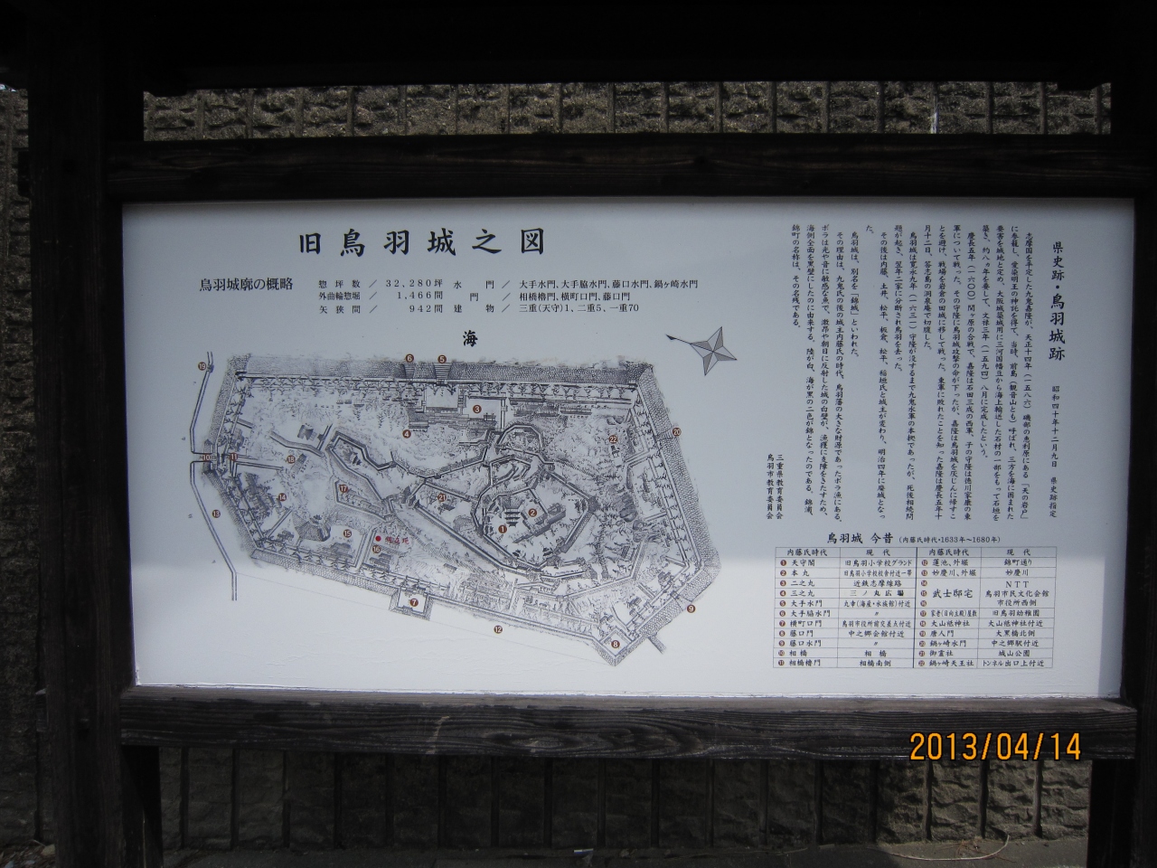 鳥羽城は、秀吉や信長に仕えた、水軍対象の九鬼嘉隆により築城され、その後、城主がいろいろ変り、1725年以降は稲垣氏が統括したとのこと。