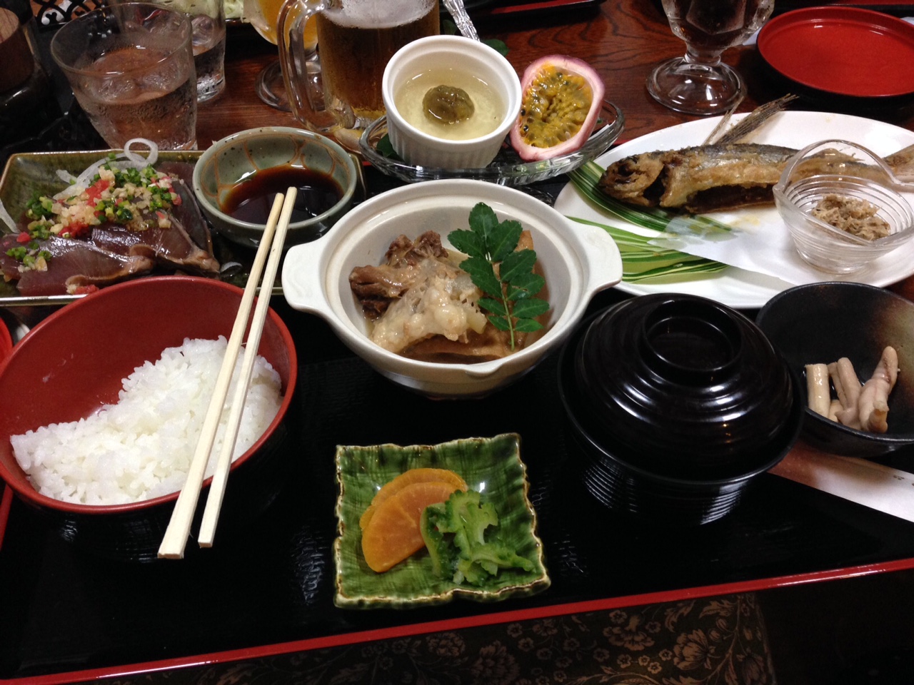 トビウオや鰹のお刺身、亀の手が入ったお味噌汁、