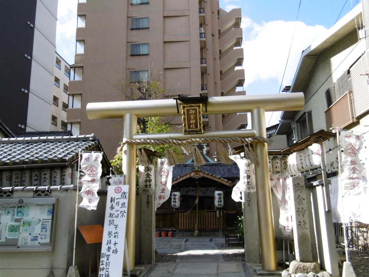 二条城から10分程歩いたビルや住宅の中にあります。黄金に輝く鳥居を見て、えっ、こんな所に?と思ってしまいます。小さな神社ではありますが、御金神社の名前にあやかって、お金持ちになりますように、目指せ一攫千金!と願いを込めて参拝させて頂きました。