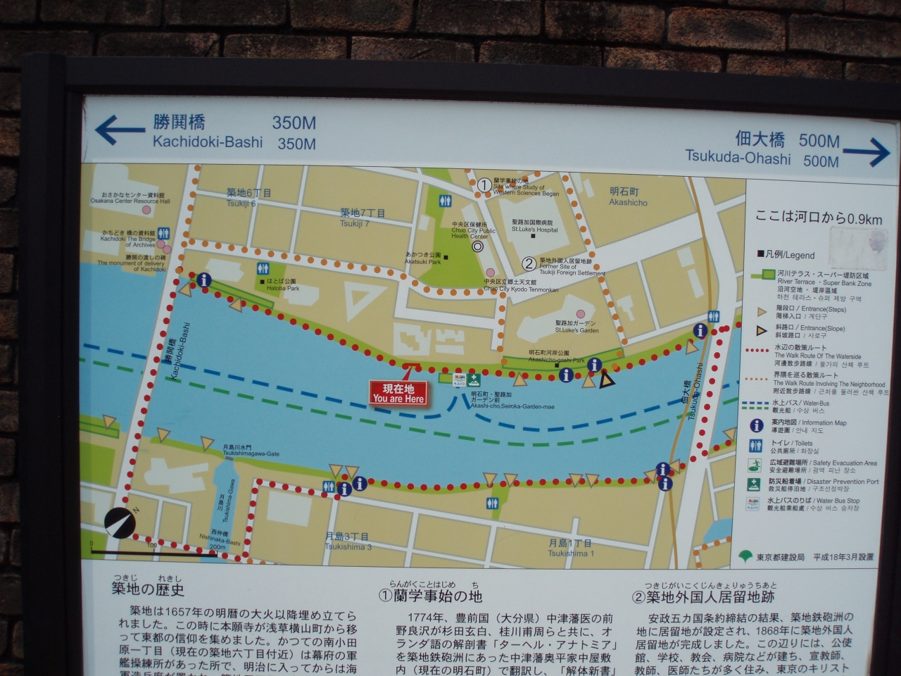 東京メトロ日比谷線築地駅から築地川公園を過ぎ聖路加国際大敷地を抜け聖路加ガーデンから明石町河岸公園に出れます。明石町河岸公園から佃大橋、勝鬨橋、隅田川の水上バスが見れて絶景です。隅田川テラスを散策するのに最適な公園です。