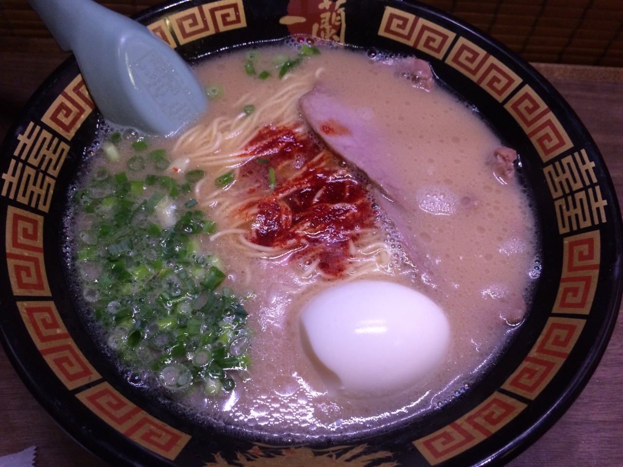 新橋駅からほど近い場所にある博多ラーメンの店です。以前は図書館みたいに衝立のあるラーメン屋が博多にあると話題になったりしましたが、今では都内でもあちこちに見かけるようになりました。スープはとんこつの臭みもなくまろやかで美味しい。表面に浮いている真っ赤な秘伝のタレがかなり辛いです。麺は博多ラーメンらしい細麺です。秘伝のタレの有無、スープの濃さ、麺の硬さ、ネギの種類などを細かく指定できます。