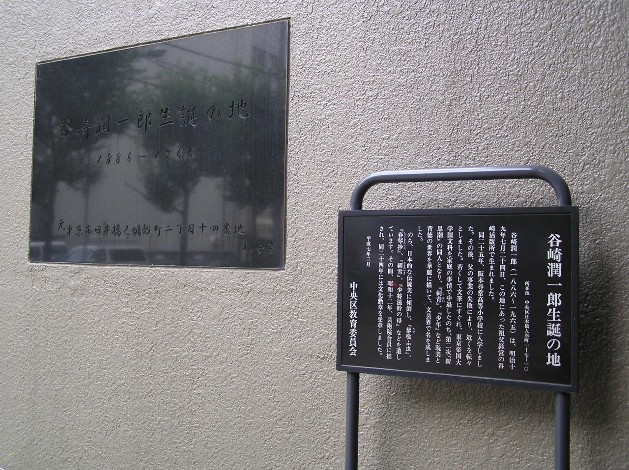 「細雪」などで知られる文豪谷崎潤一郎は1886年、東京のこの地に生まれた。この地にはかつて、祖父が始めた活版印刷所があったが、経営不振のため潤一郎が3歳のとき売却され、その後は学費を納めるにも事欠くようになった。