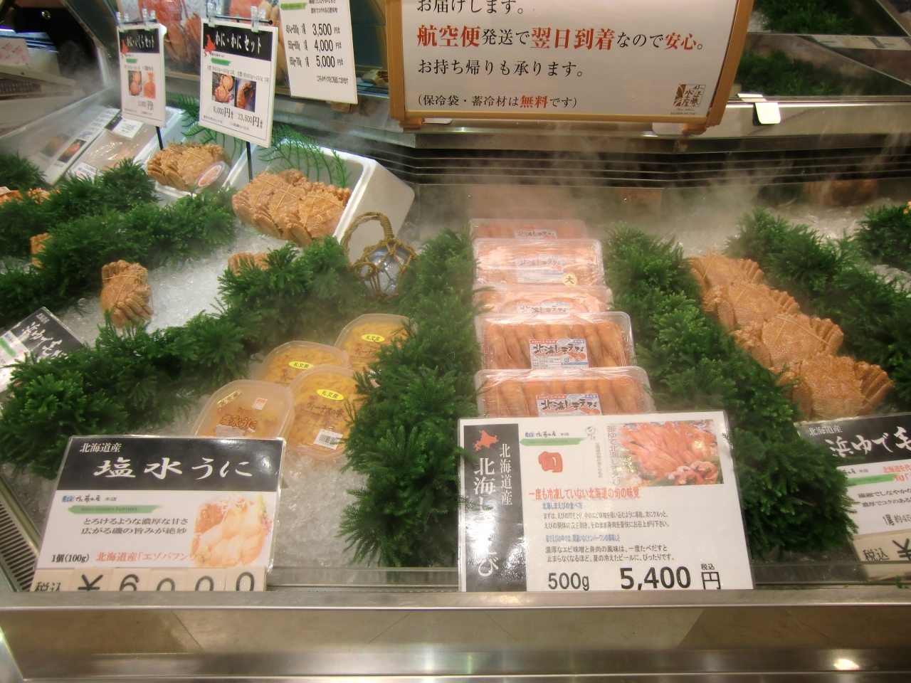 札幌駅前にある高級海産物を取り扱うお店です。お店の看板に「高品質海産物専門店」とある通り、品質の良い商品を取り扱っています。カニや旬の塩水ウニなどが並んでいましたが、高価すぎて残念ながら手が出ませんでした。でも贈り物には最適だと思います。