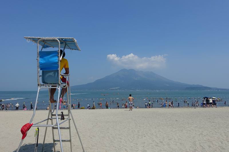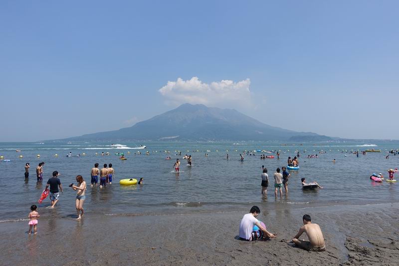 仙巌園の近くにある海水浴場で、鹿児島市中心部からは一番近い海水浴場になるかと思います。海の向こう側、正面に桜島の絶景が見える最高のロケーションです。砂は黒っぽくてそんなにきれいに見えませんが、海水はまあまあきれいかなと感じました。