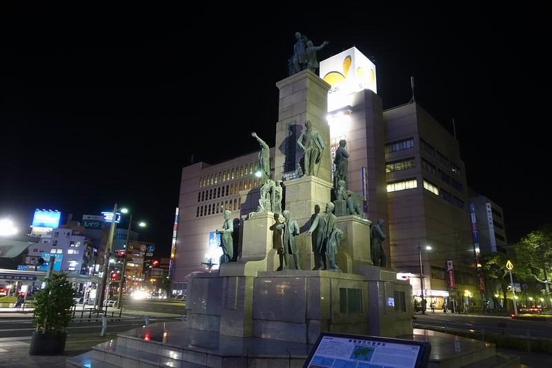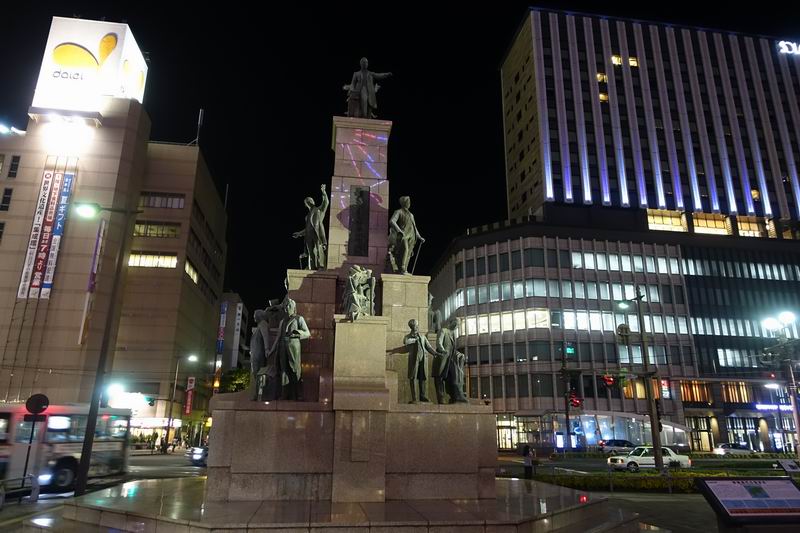 薩英戦争の後、薩摩藩が英国に密かに派遣した使節と留学生19人のうち薩摩藩出身の17人の銅像です。17人のうち森有礼だけ知ってました。鹿児島中央駅東口の駅前で人通りはあるものの、地元の人が多いのか足を止めている人はほとんどいませんでした。それほど観光名所って感じではないようです。夜はライトアップされていました。