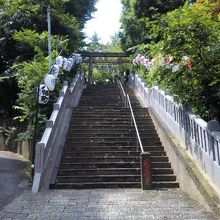 オフィス街のビルの狭間に鳥居、その先には急な石段があり、近くの愛宕神社に似ています。