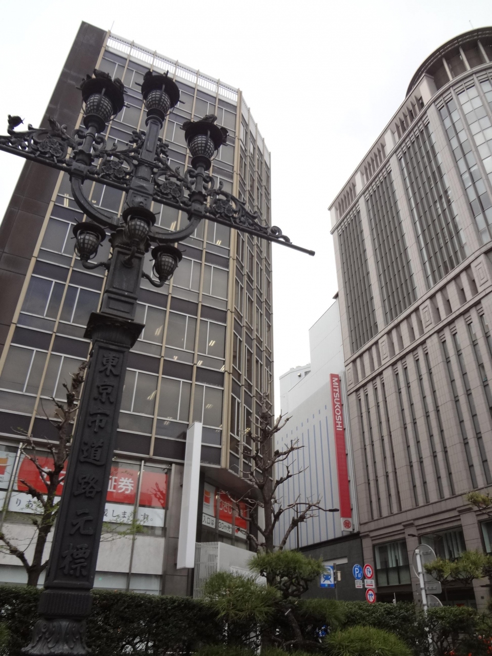日本橋のたもと、三越側の方に、道路元標があり、そこを見上げると東京市道路元標と書かれた、昔の街灯があります。現在の日本橋が掛けられたときに、造られたそうです。東京オリンピックを経て、日本橋の風景は大きく変わったそうですが、今度は良い風に変わってほしいと思います。