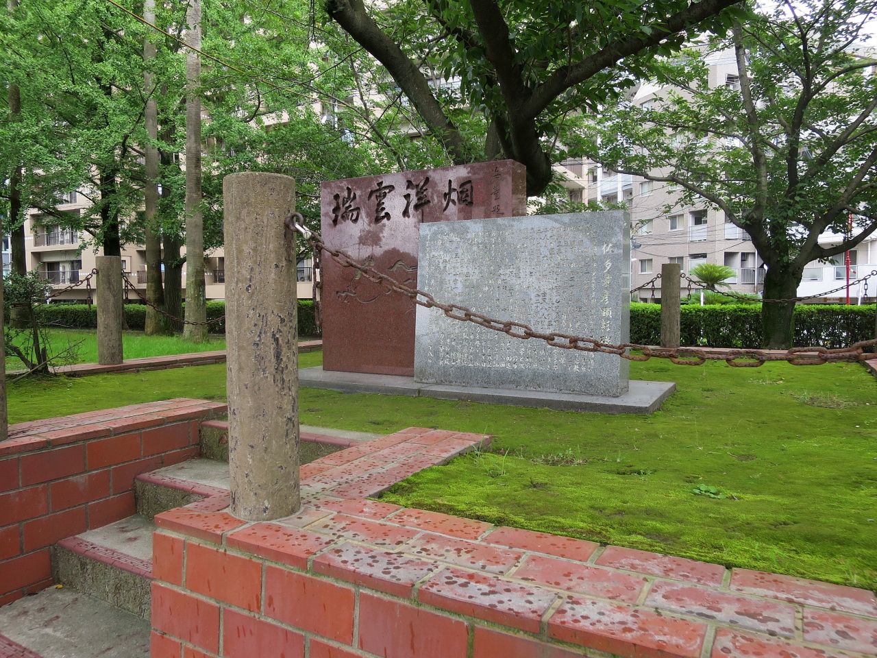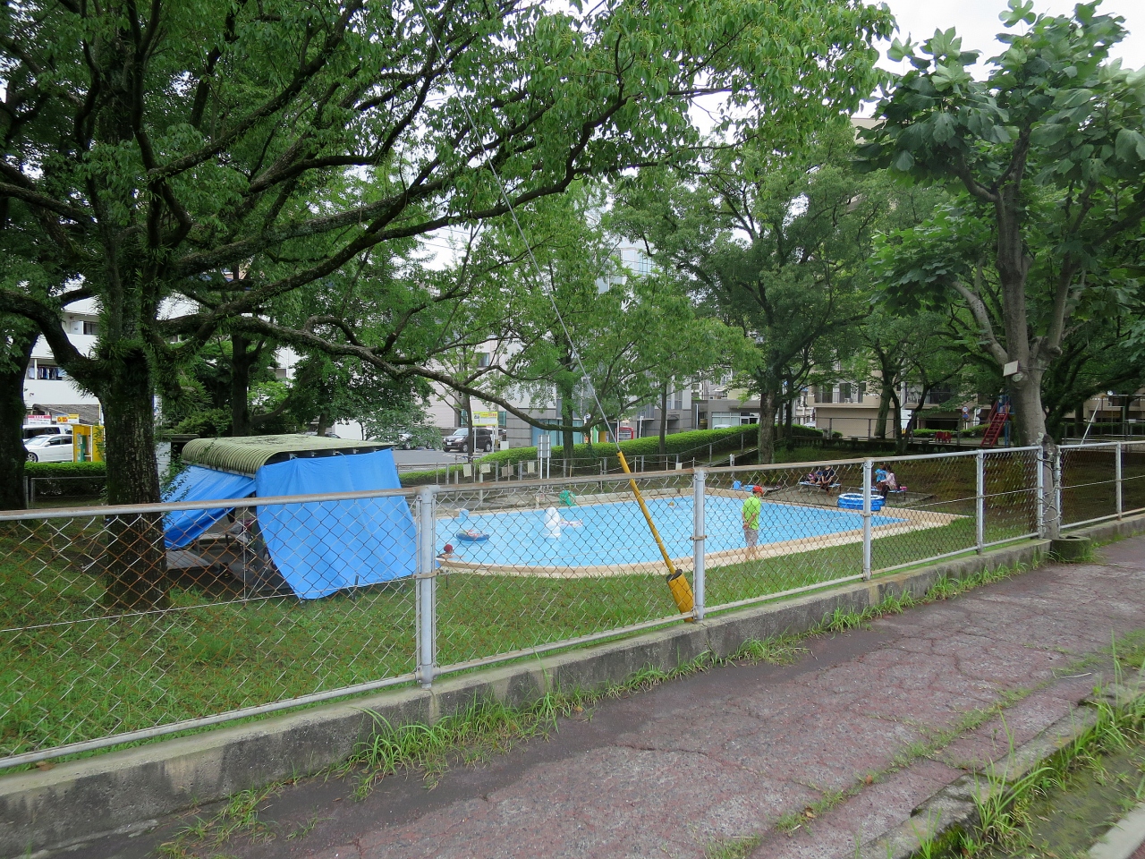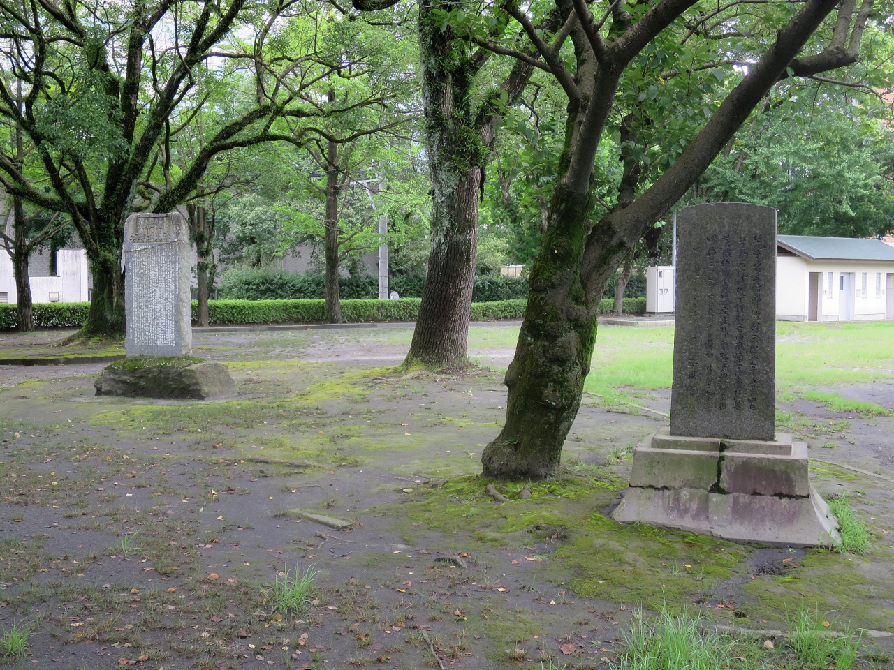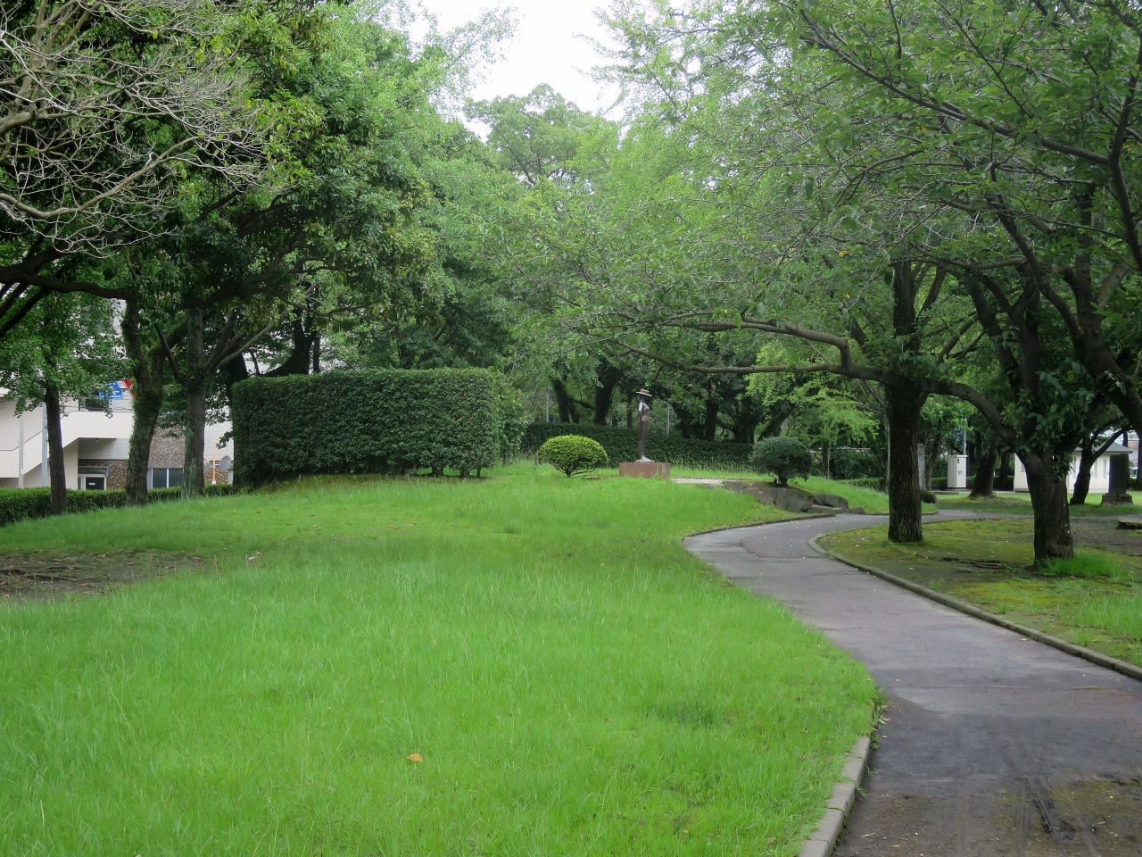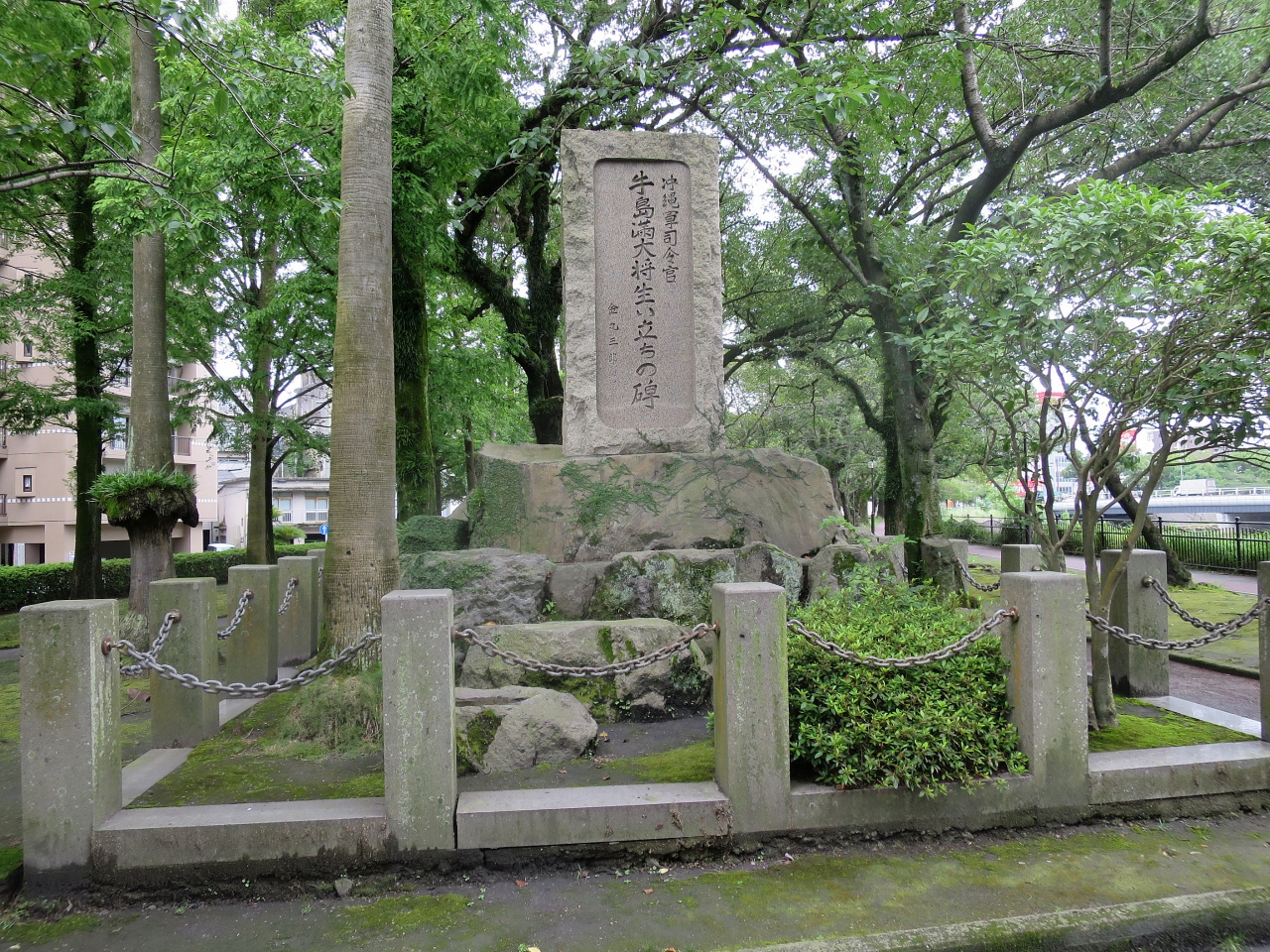 「高見橋」から甲突川沿いの「歴史ロード“維新ふるさとの道”」をぬけて「高麗橋」を渡ると、その先に続く緑地帯です。緑地帯にはスイミングプール、「牛島満生い立ちの碑」を始めとするいくつかの碑や「帽子の像」などといったオブジェが建てられており、統一性のなさを感じる一歩、「これ、何だろう?」という楽しみ方も見つけました。