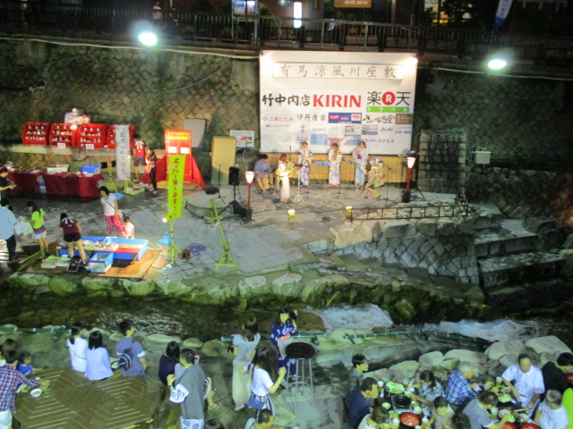 明るいうちはなんだか工事しているようでガッカリ。日暮れると、なんと川底が納涼床?皆さん座敷ですき焼きを囲んでいます。ステージもあります。夜店も出ています。夏ならではのイベントなんでしょうが、川底が整備されて、歩きやすく、楽しめるスポットになっています。