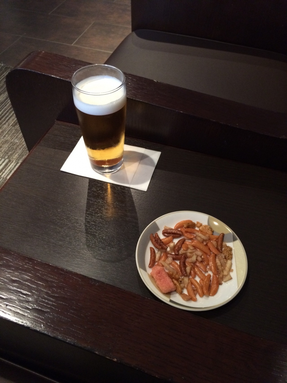 早朝ということもあり利用者はまばらで、1割程度の混雑度?でしょうか。飲み物はビールとソフトドリンク、食べ物はあられのみの提供です。ダイヤモンドプレミアはメゾンカイザーのパンがあるようですが、サクラにはありません。仕方なく朝からビールとあられをいただきました。