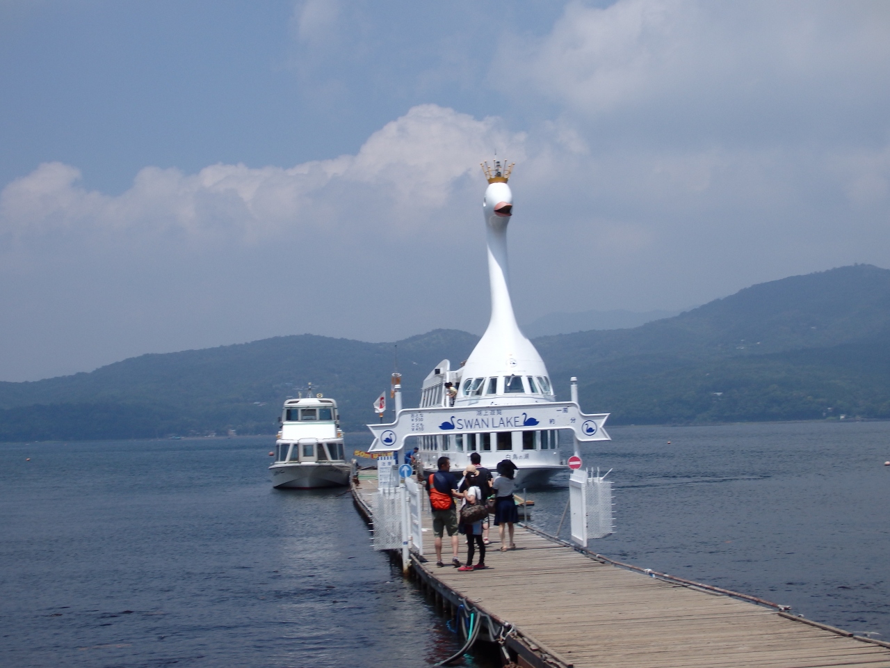 山中湖を遊覧するこの「白鳥の湖」は、旭日丘公園とその対岸に2つの桟橋があり、そこから決められた時刻に出航します。旭日丘桟橋の近くには、無料駐車場や食堂がいくつかあり、自家用車で訪れても安心です。