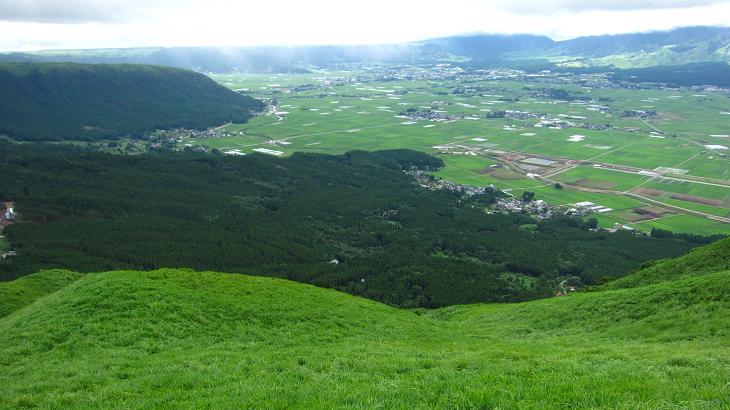 見晴らしのいい高台にあります。駐車場から少し歩きますが、ここからは阿蘇山などの雄大な景色を望むことができます。駐車場にあるお店には、熊本土産や阿蘇牛の牛乳、ソフトクリームなどが売っていました。