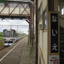 いまどき珍しい階段や天井が木造の跨線橋を越えた島式ホームが札幌方面です。
