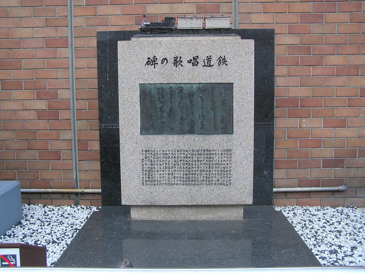鉄道唱歌は、東海道線が全線開通した10年後の1899年、大和田建樹が作詞したもので、1番は新橋を歌っている。1957年、彼の生誕100年を記念して建てられた。