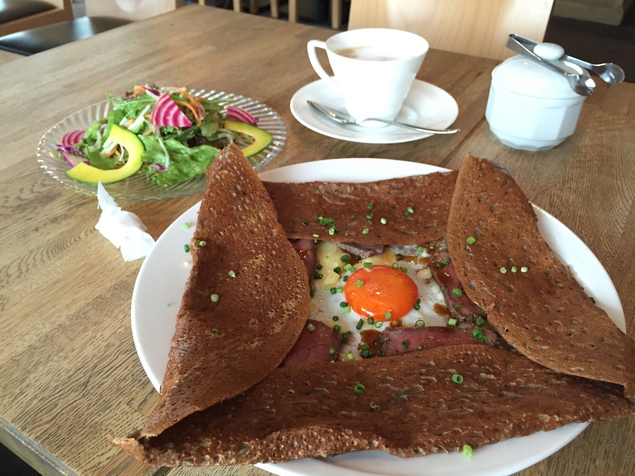 ランチサラダが毎回とても彩りキレイで、お店のていねいな仕事ぶりが感じられます。セットスープも美味しいです。ガレットはボリュームがありおなかいっぱいになります。自由が丘らしい雰囲気のおすすめカフェです。