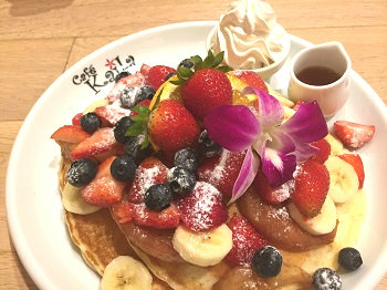 ハワイで行きそびれたカフェカイラがイクスピアリにあったので、行ってみると待ち時間もなくすんなり入店できました。こちらはフルーツがたっぷりとのったパンケーキが紹介されることが多く食べてみたかったので2人でシェアしました。晩ごはんあとだったので、2人でも辛かったです。新鮮なフルーツが美味しく、甘すぎず美味しかったです。店員さんもみなさん気さくな感じで声をかけて頂き好印象。リピートしたいお店でした。