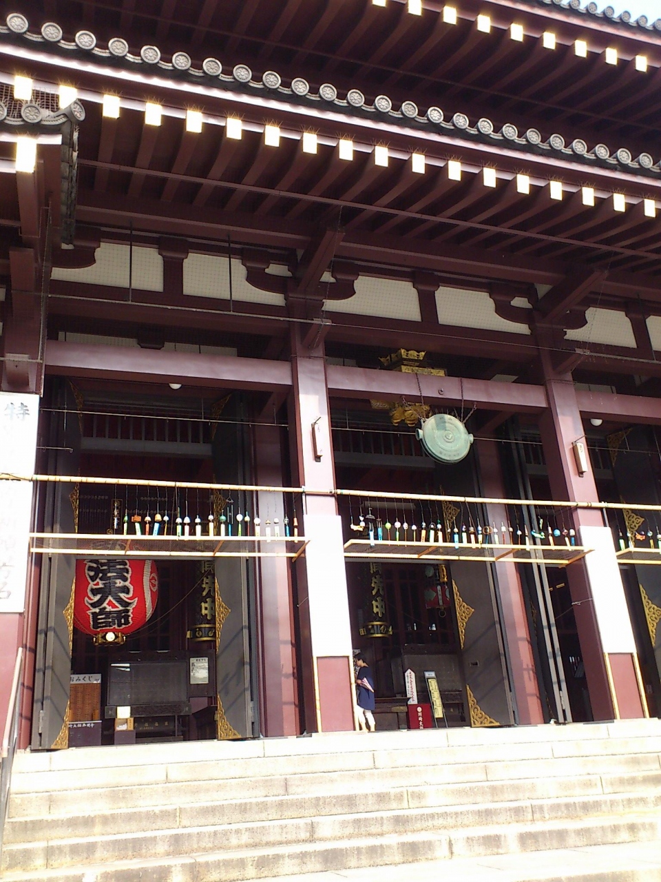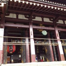 厄除けで有名な川崎大師の本堂です。大山門から境内に入ると、目の前にあるとても立派なお堂です。本尊はお寺の名前の通り弘法大師で、そのまわりに不動明王や愛染明王などの諸仏が安置されています。弘法大師と書かれた大きな赤い提灯がぶら下がっています。由緒あるお寺なのでしょう、菊の御紋が見受けられます。