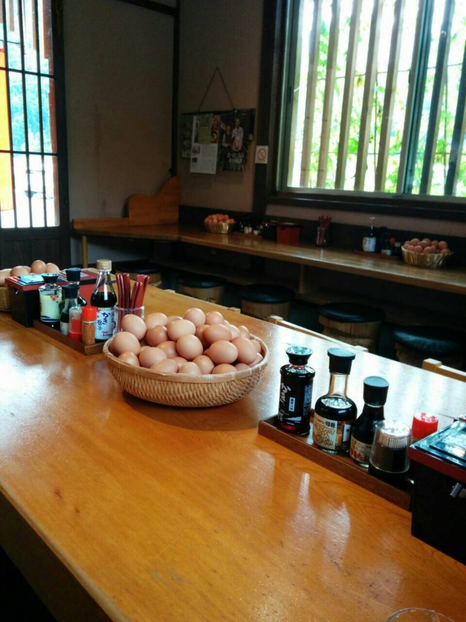 卵かけごはん名店。このために豊岡まで来る意味があるほどです。新鮮な卵が机の上に用意されています。そしてかけ放題。卵かけごはん専用のオリジナル醤油も用意されています。実はオムレツも人気です。おいしい卵って幸せになります。