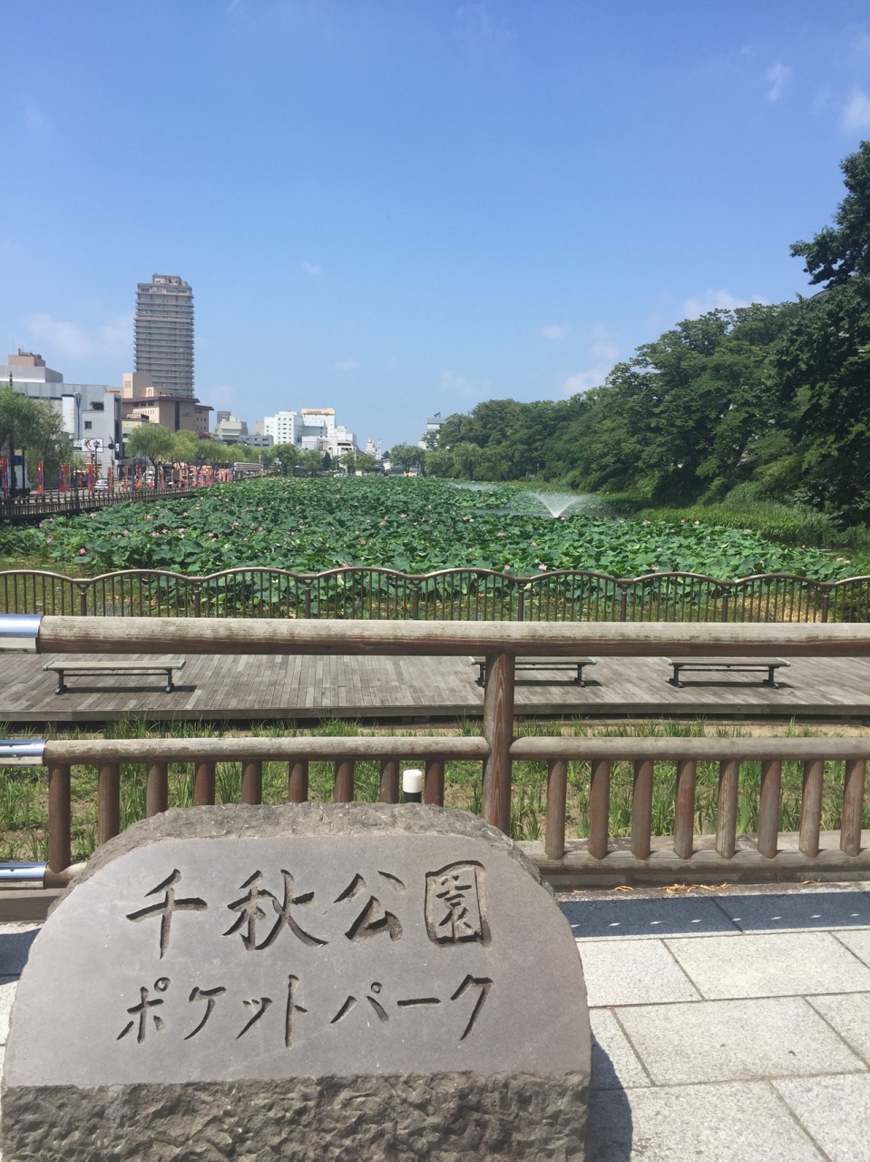 街側に面したお堀跡は ちょうど竿燈祭りの頃は一面に蓮の花が咲いている。