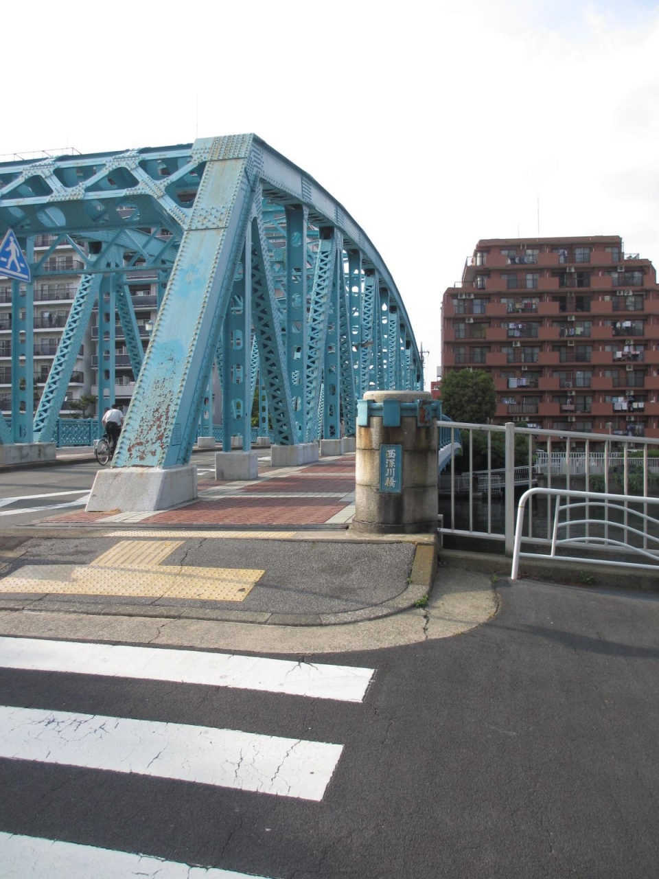 小名木川に架かる橋です。隅田川から数えると、萬年橋、高橋(たかばし)、そして西深川橋と3本目の橋になります。写真を見ていただけるとわかると思いますが、色がとても印象的でした。北詰東側には幸福の魚 GOMBESSAというオブジェがあります。
