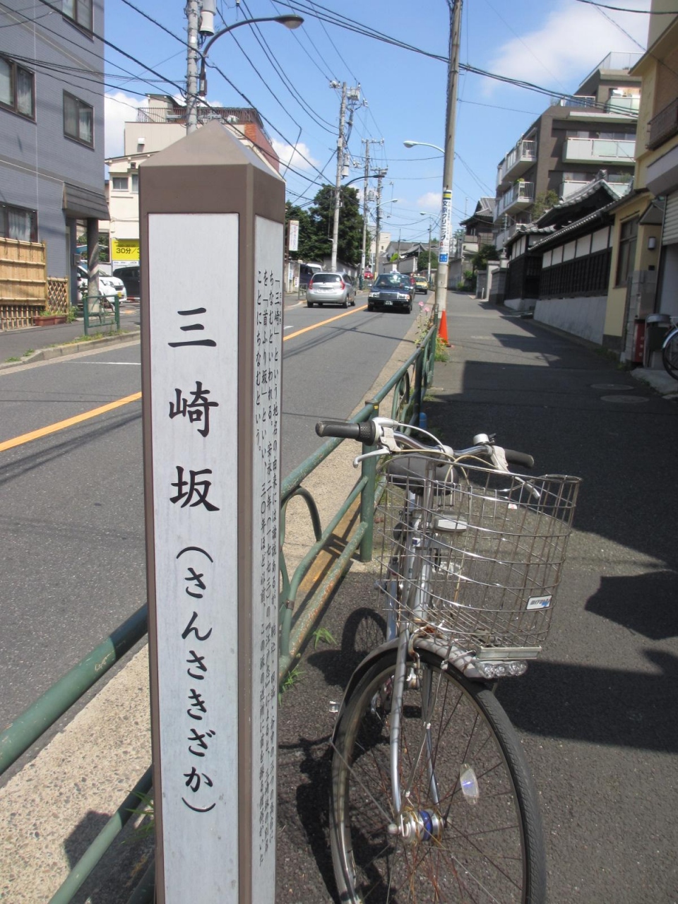 「みさきざか」ではなく「さんさきざか」と読みます。標柱に記載されている説明書きによれば、別名を「首ふり坂」ともいうそうです。この先の近所に首を振る僧侶がいたことにちなむそうです。この坂の両側にはたくさんの寺院があるのが特徴だと感じました。