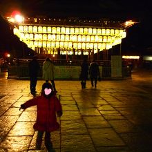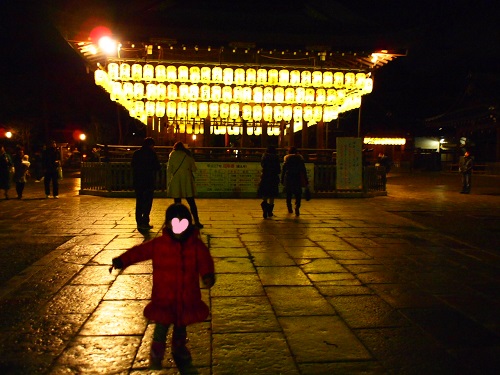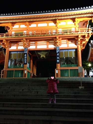 1月の夕方に祇園に着いたので、そこから行きました。私は特に興味がなかったのですが娘が行ってみたいとの事で寄ってみることに。夜だったせいか静かで、人はちらほら。屋台があって娘が食べたいというので買いましたがあまりおいしくなく、娘も食べず私は半分食べたくらい。でもお兄さんが親切で娘におまけの食べ物をくれました。