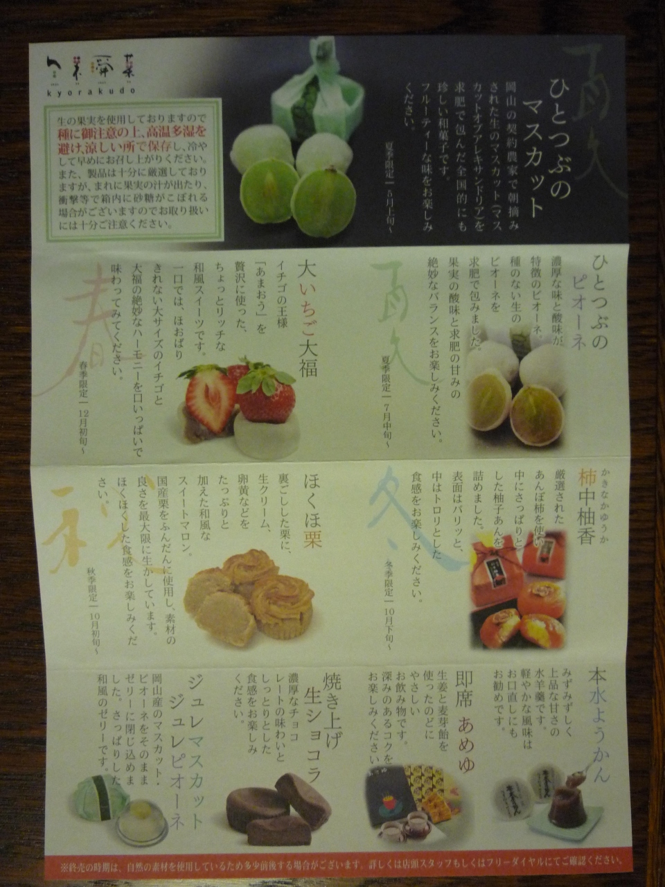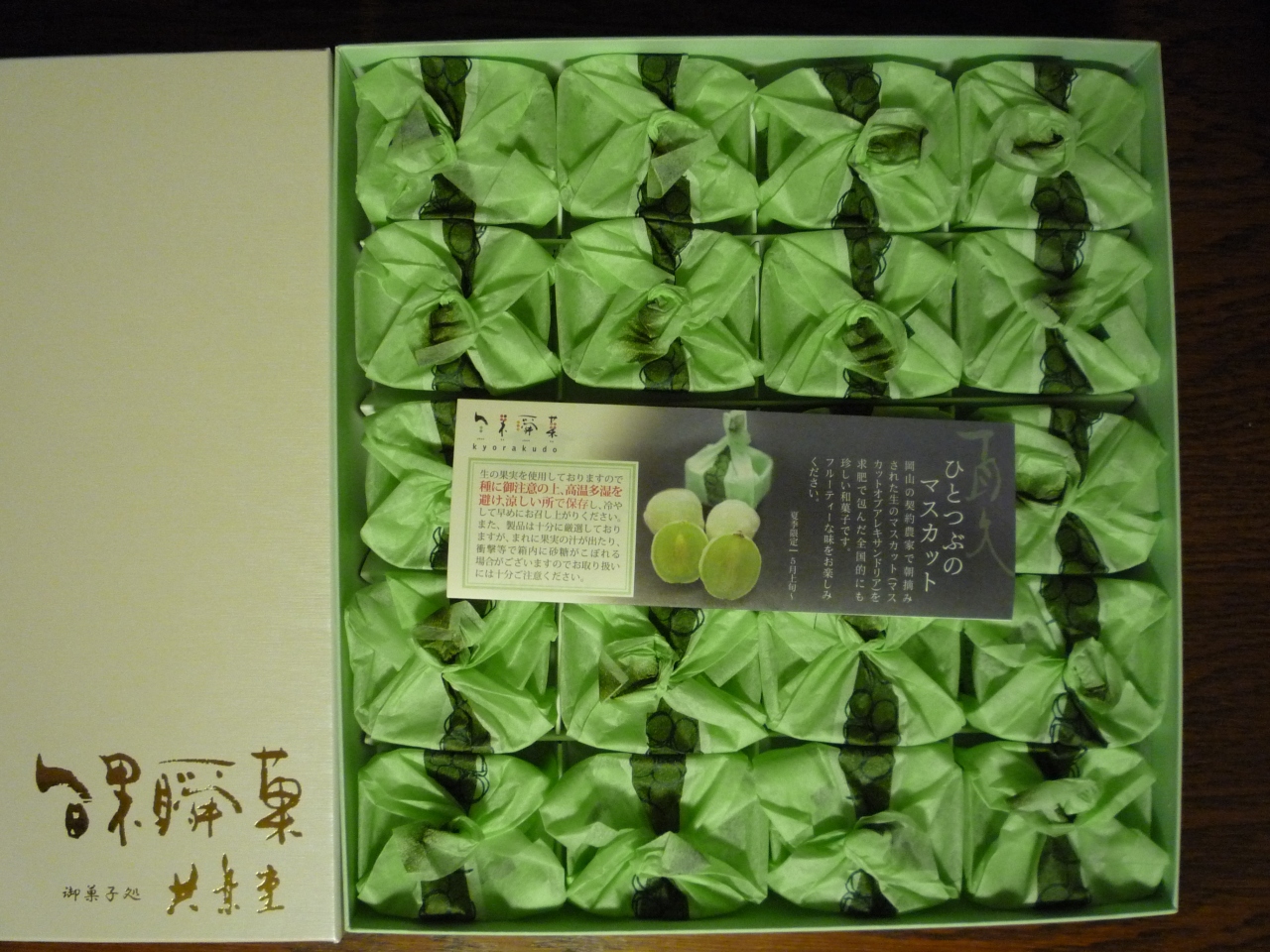 今回は,旅行中に銀座三越の催事で再会しました.「ひとつぶのマスカット」の試食をたくさん出されていて納得して買うことができました.ちなみに試食はどんどん出していましたが,すぐになくなってしまう状態でした.似たような和菓子はほかのところでも出していますが,同様のクオリティで価格が安いのがうれしいです.ただ,たまにちょっと水っぽいがあるのは仕方ないですね.ピオーネなどもおいしそうです.